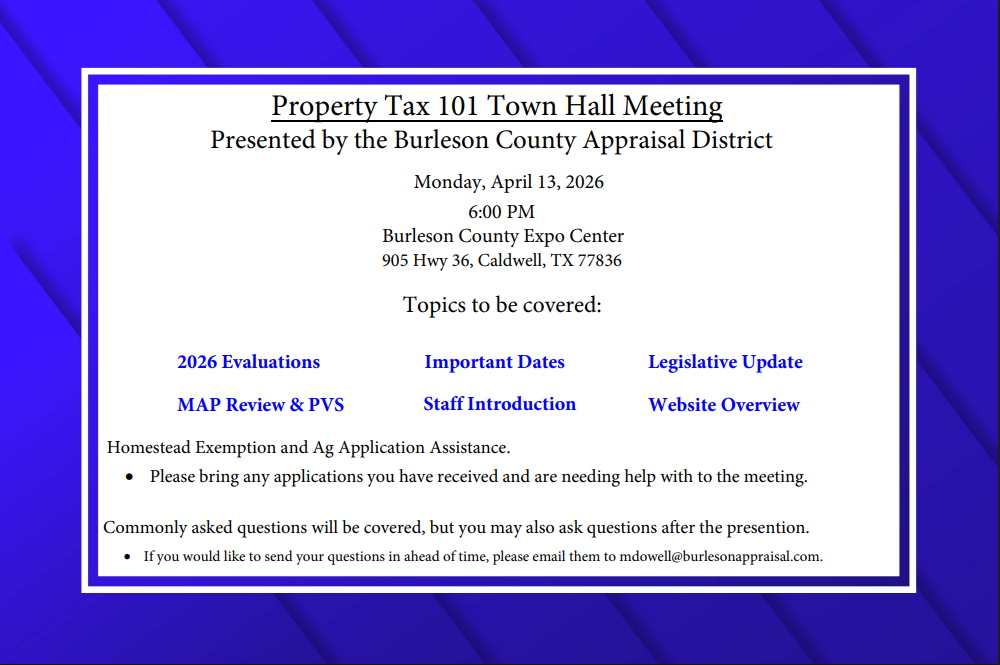 Burleson County Appraisal District (BCAD) is responsible for appraising property for the purpose of ad valorem property tax assessment on behalf of the 11 local entities in Burleson County. The appraisal district is a political subdivision of the State of Texas. The district appraises property according to the Texas Property Tax Code and the Uniform Standards of Professional Appraisal Practices.